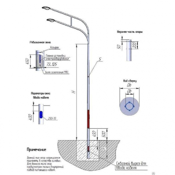 Подвод кабеля производится внутренним, подземным способом. Внутри опор прокладывается питающий кабель, доступ к оборудованию обеспечивается через ревизионный люк.